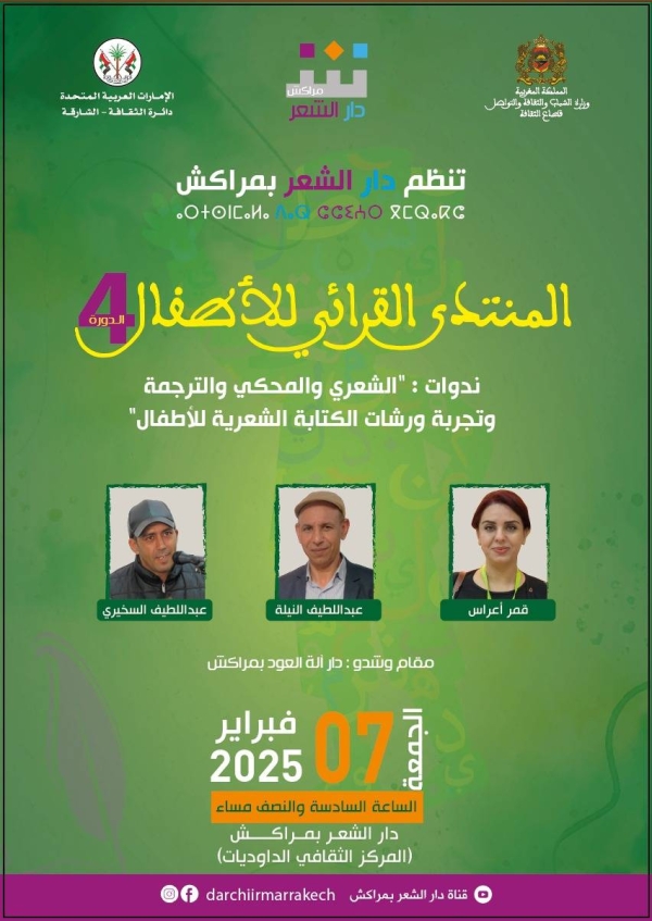 تنظم دار الشعر بمراكش، يومي 7و8 من الشهر الجاري، فعاليات الدورة الرابعة للمنتدى القرائي للأطفال، وهي التظاهرة التي خصصتها الدار للتحسيس بالفعل القرائي لدى الأطفال واليافعين والشباب، بموازاة برامجها التي أمست تقليدا تابتا يؤسس لمشتل إبداعي كبير ينمي مهارات المنتسبين، من فئات عمرية متعددة.